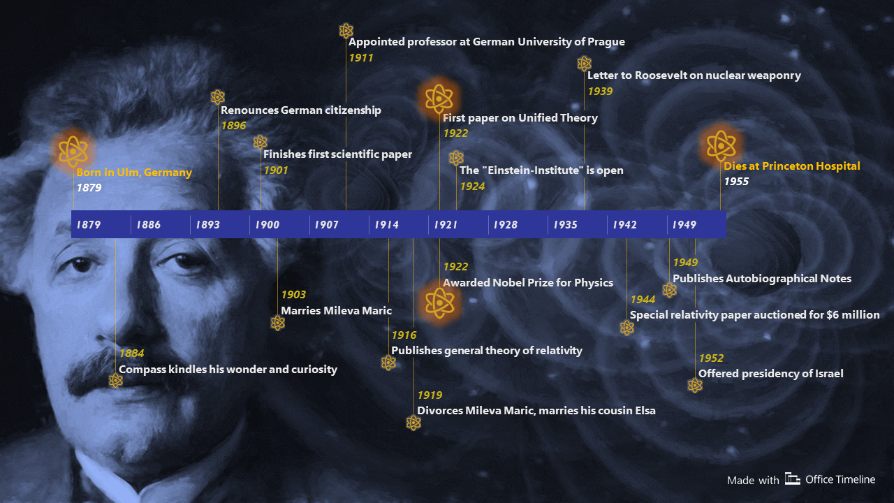 You can download the Albert Einstein timeline for free as a PowerPoint file which contains two slides, a condensed version and a more detailed one.