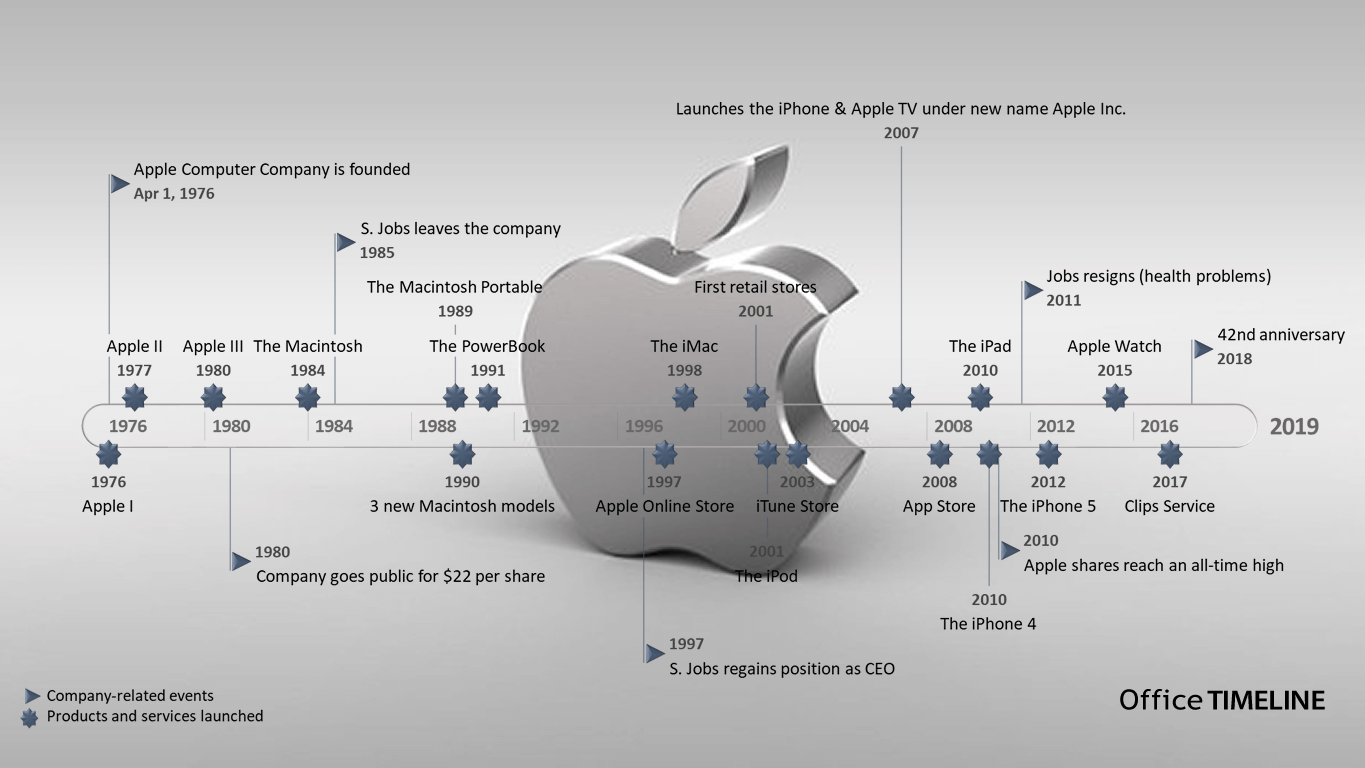 The Apple Inc. chronology was built with Office Timeline, an easy-to-use PowerPoint add-in that creates professional timelines, visual plans, Gantt charts and other similar graphics with only a few clicks. You can further modify our slide using the free 14-day trial of the tool.