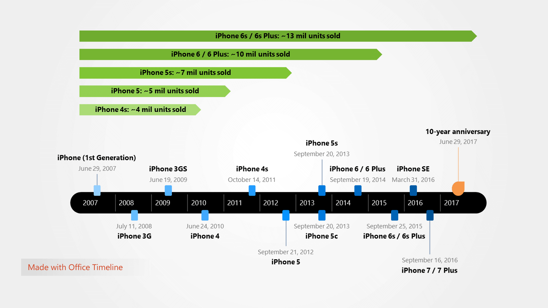 The illustration was created using the Office Timeline add-in for Microsoft PowerPoint and is free to copy or reproduce for personal or public use. To create similar visuals fast, we recommend using the free edition of Office Timeline, a tool that allows users to easily build timelines, schedules, Gantt charts and other similar graphics for personal, academic, legal or business communications. The free add-in can also be used to edit or update the iPhone Timeline PowerPoint slide, while the Plus version of the software unlocks more advanced customization options and other potent features.
