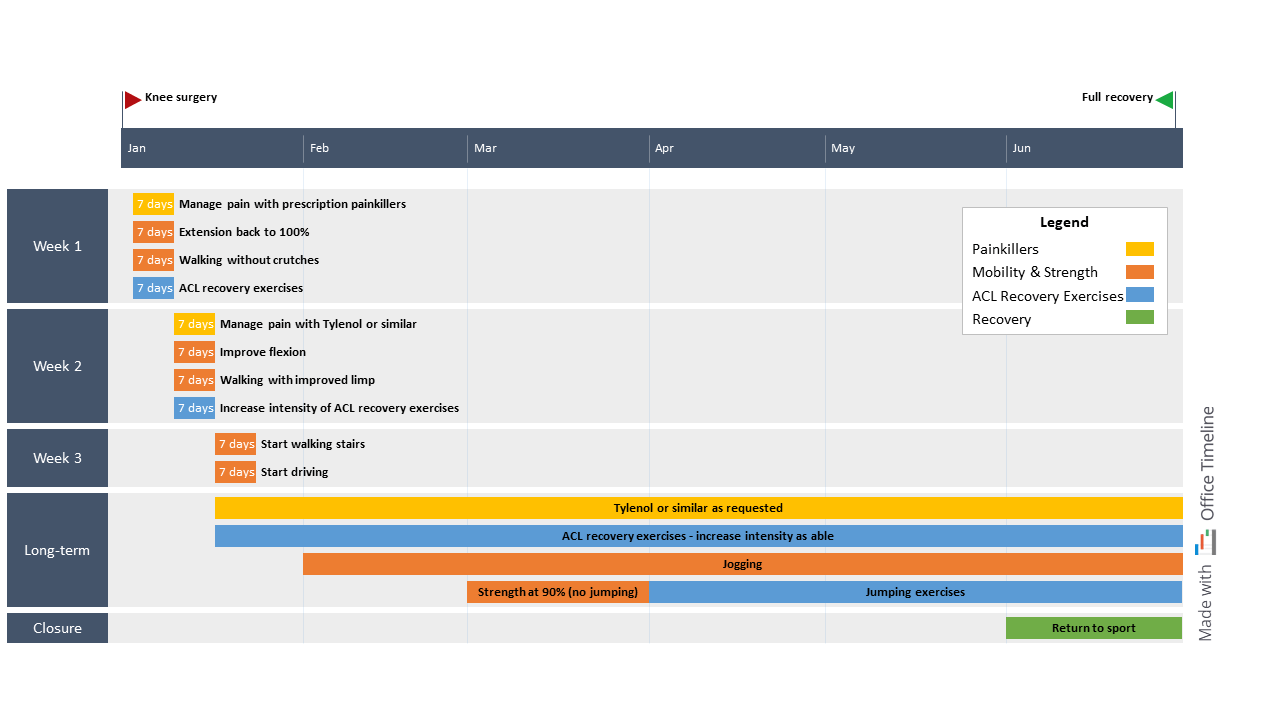 So Beatrice set out to create a 6-month recovery roadmap for a routine knee surgery, from the day of the operation until full recovery, using the new tool. It didn’t take much for her to fall in love with the add-in’s ease of use and highly customizable visuals.