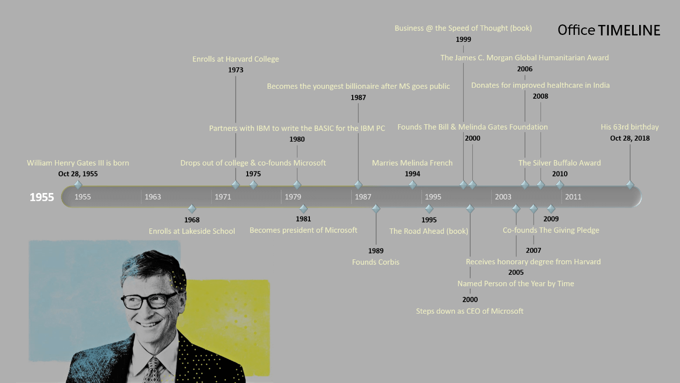 The Bill Gates chronology was built with Office Timeline, a lightweight add-in for PowerPoint that enables users to quickly create professional-looking timelines and Gantt charts. The image is free to download and share and can be restyled or updated using the Office Timeline Plus Edition.