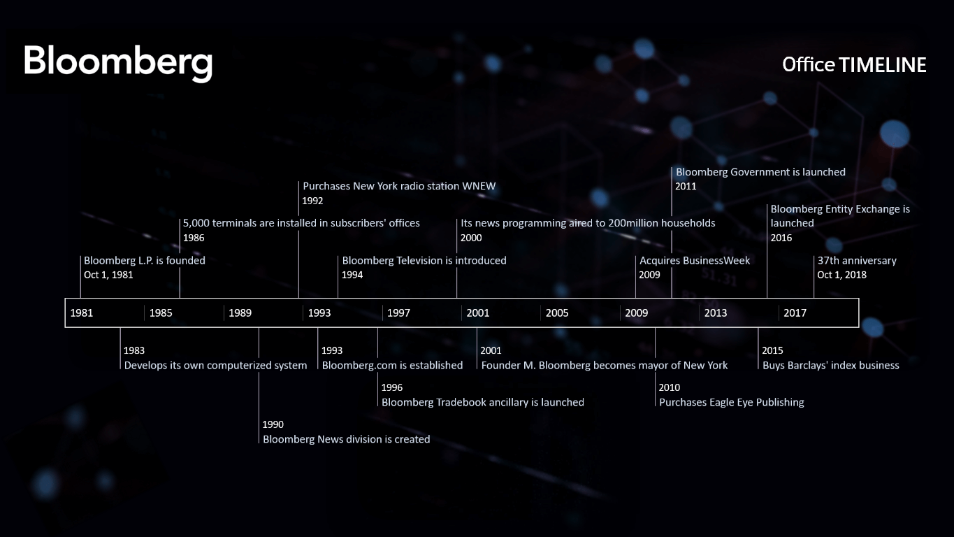 The Bloomberg L.P. chronology was designed with Office Timeline, a user-friendly plugin for PowerPoint that helps you create professional-looking timelines, Gantt charts and other similar visuals almost instantly. You can copy and share the image for free, and can update or restyle it using the Plus version of the tool.