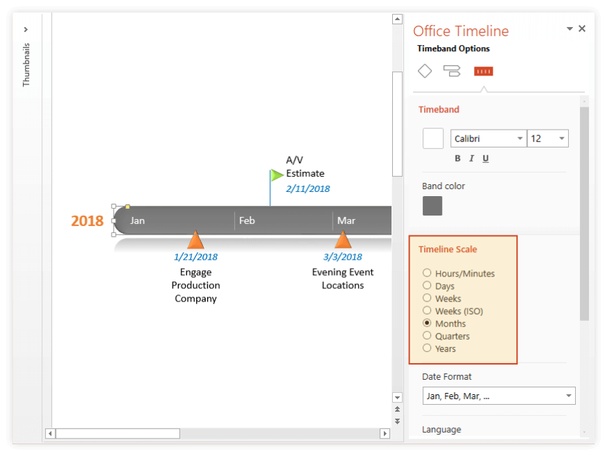 2. With the timeband selected, go to the Timeline Scale section in the Office Timeline Style Pane on the right (pictured below). Here, pick a new timescale from the options available (Hours/Minutes, Days, Weeks, Weeks (ISO), Quarters or Years). The add-in will automatically update your timeline. You will also find the language control for the timeband here. Use it to change the language of your timeband’s scale if you have an international audience.