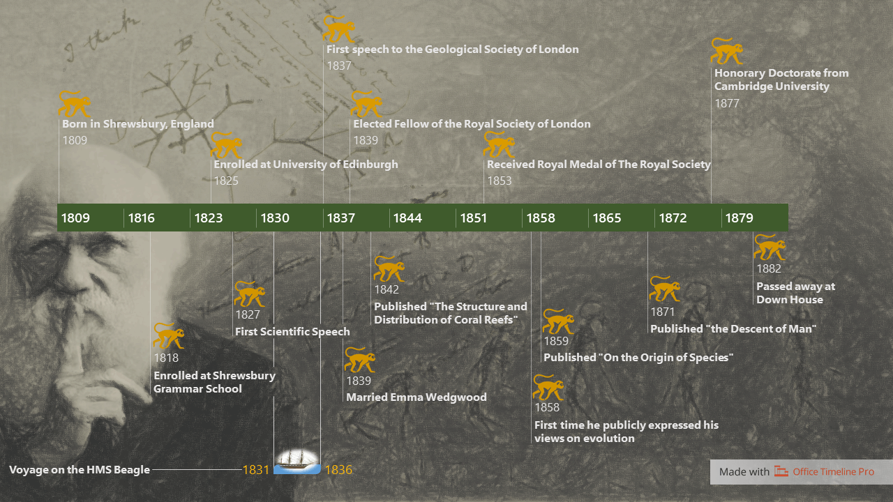 The Charles Darwin Timeline was built using the Office Timeline PowerPoint add-in, a robust and easy to use project management tool capable of creating attractive visual representations of your data within minutes. Try out the free version or explore the Pro Edition, which comes with extra features for those who need more advanced applications. You can download the Charles Darwin timeline as a PowerPoint file and enter any historical milestones that you believe we may have missed. Have a happy Darwin Day!
