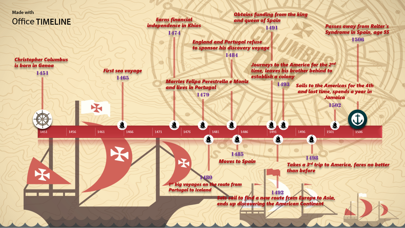 The exploits of Christopher Columbus were mapped out chronologically using Office Timeline, a professional and easy to use Gantt chart maker that can quickly generate a beautiful graphic representation for your project’s stages within minutes. You can try it out in the free version, but access to the more complex features such as ‘Swimlanes’ is only available in the Pro edition. Download the Christopher Columbus timeline as a .PPT file and have fun moving the elements around, using either our add-in or the native PowerPoint controls.
