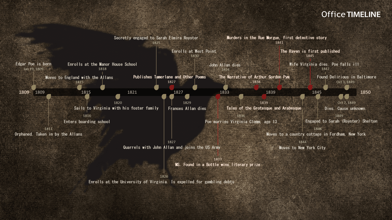 The Edgar Allan Poe chronology was created in PowerPoint using the Office Timeline plug-in. To edit the timeline quickly or create similar images for personal, academic or business use, we recommend the Plus version of the software.