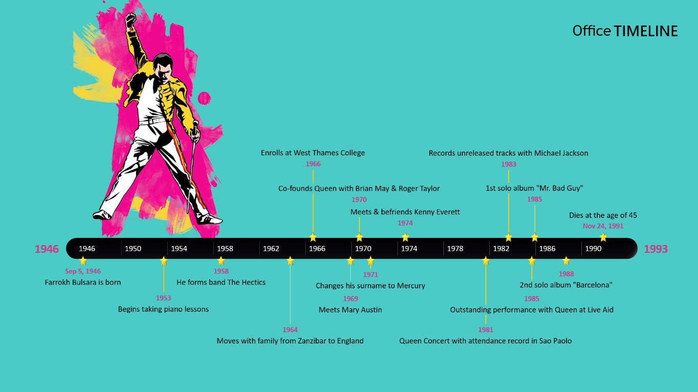 The Freddie Mercury chronology was created with the Office Timeline add-in for Powerpoint, a user-friendly tool that generates eye-catching timelines and other visuals almost instantly. The slide, which is free to copy and share, can be further restyled using the free Office Timeline 14-day trial.