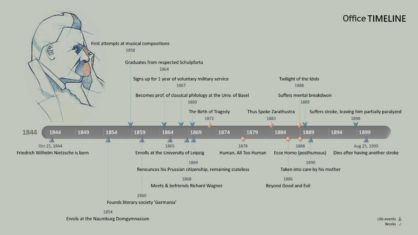 The Friedrich Nietzsche chronology was created with Office Timeline, a user-friendly PowerPoint plugin that enables you to easily build professional-looking timelines, Gantt charts and other similar visuals. You can copy and share the image for free, and restyle it using the Plus version of the tool.