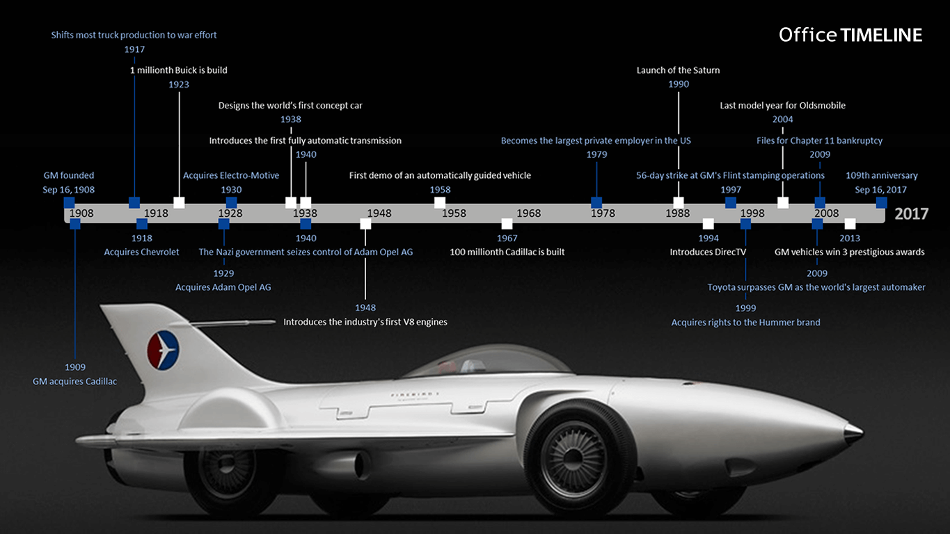 The General Motors chronology was built in PowerPoint using the Office Timeline add-in, a simple, familiar tool that enables users to quickly create impressive timelines, Gantt charts and other similar visuals. To edit the graphic or create your own, we recommend using the Plus edition of the add-in, which comes with powerful time-saving features and a large variety of customization options.
