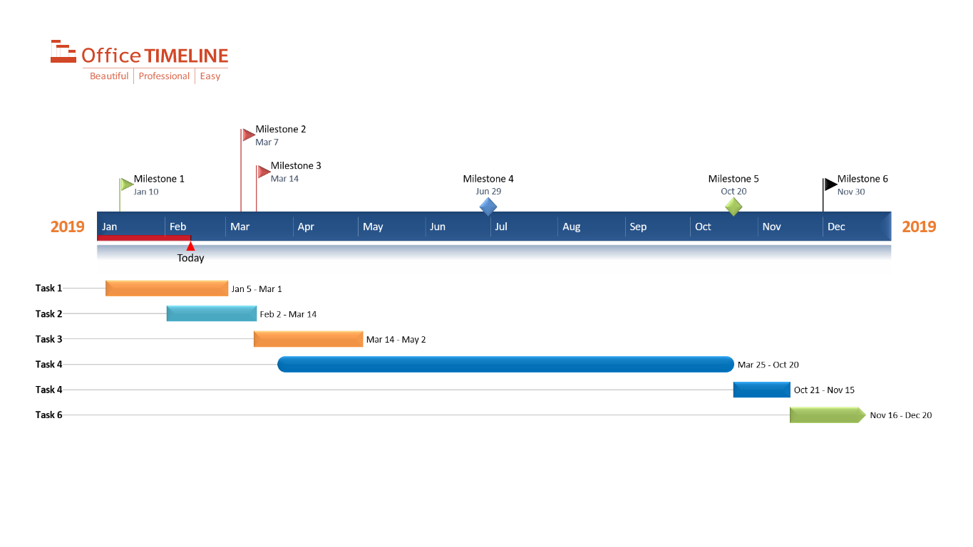 Applying this strategy becomes even easier when using external structuring tools, such as the intuitive PowerPoint add-in called Office Timeline, which helps you turn your to-do list, schedule or activity plan into a beautiful and clear timeline. You can kick-start the process with our slide here (which is free to copy and share), and can add more milestones and tasks to the graphic using the Plus version of the tool.