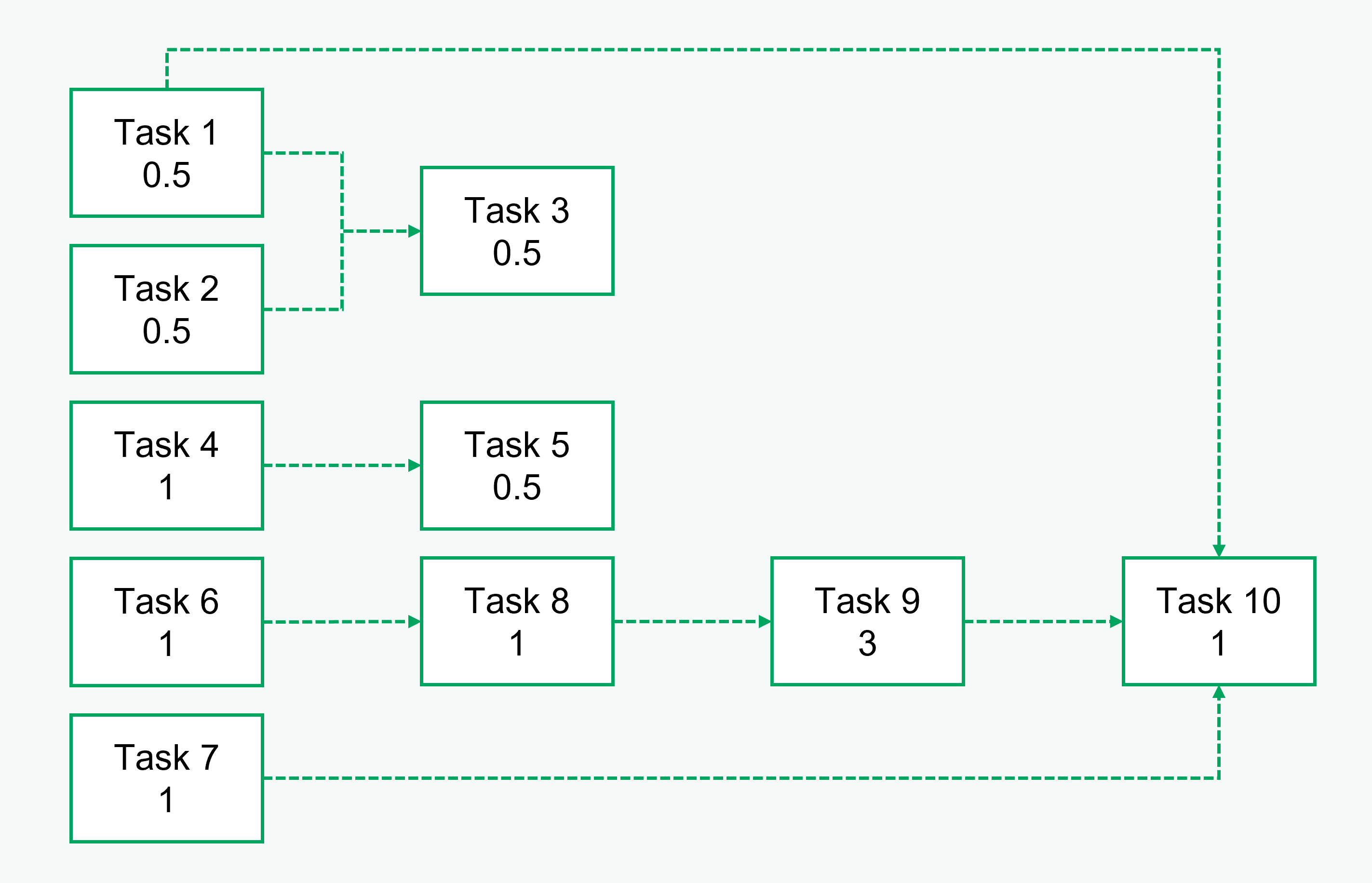 As you can see from the image above, Task 1 points to Task 3, for instance, because the latter can only proceed when the former is finished.