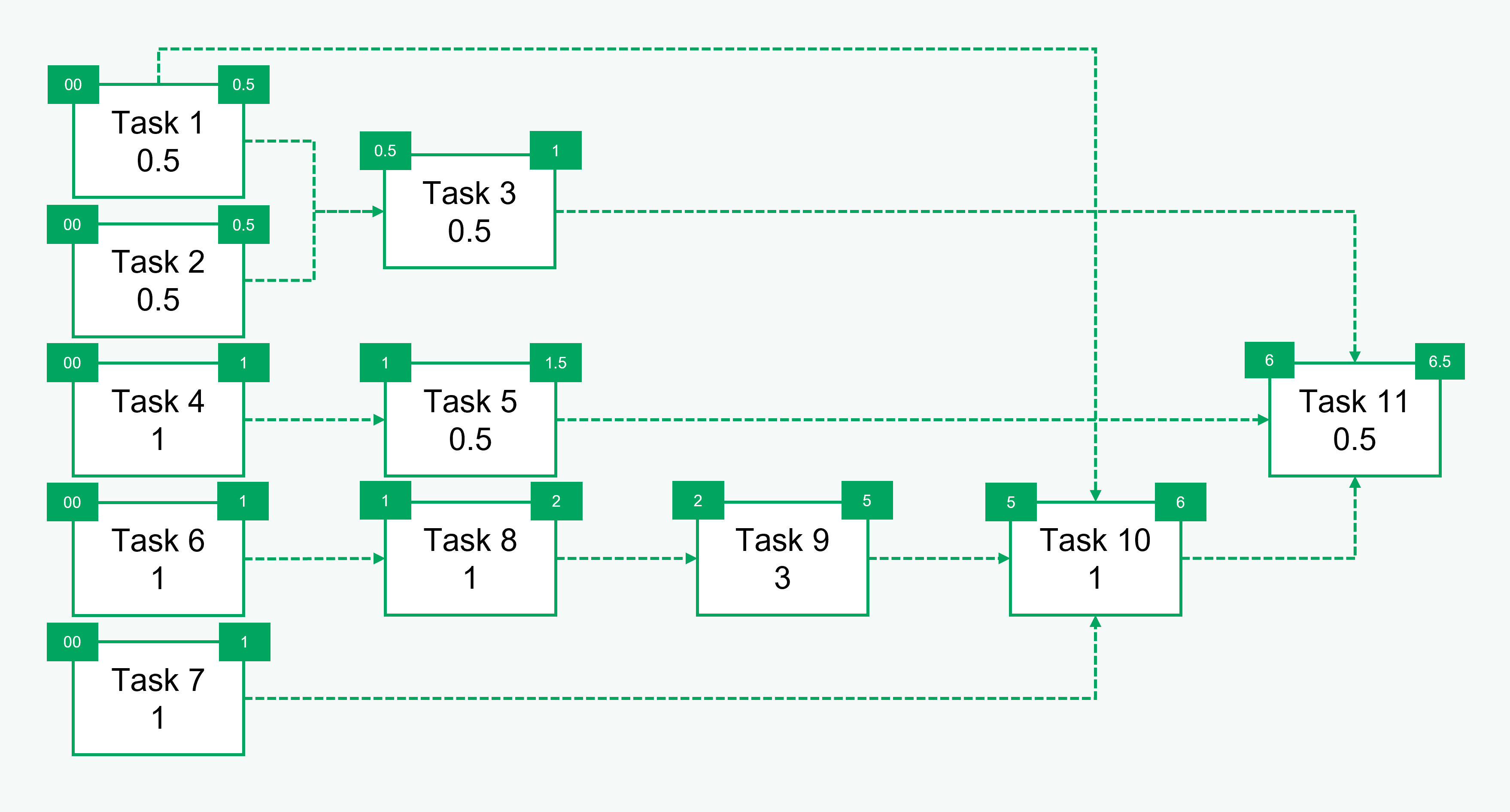 In our example, if Task 1 starts at day 0 and it takes 0.5 days to complete, then its end time is 0.5. For Task 3, start time is 0.5 and end time is 1.