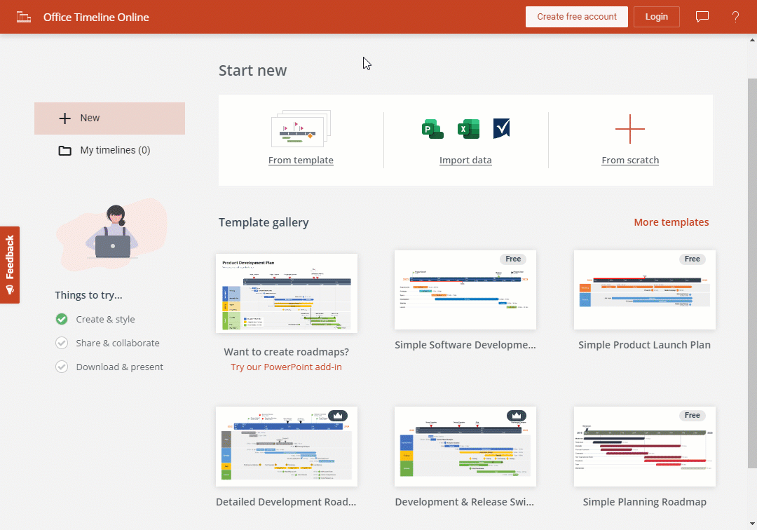 To quickly make a Gantt chart online free of charge, first access Office Timeline’s web app, which is a simple tool that will help you build your visual in minutes, without you having to install anything or create an account.