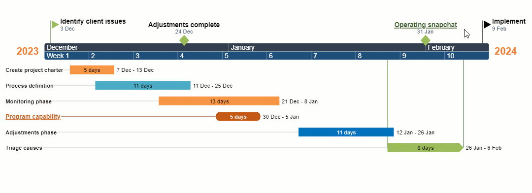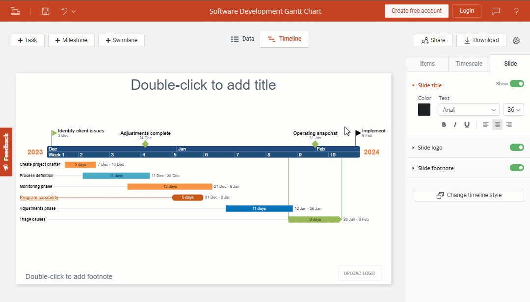 Office Timeline not only allows you to quickly make a Gantt chart online free of charge – adjusting and updating your visual is incredibly simple too. Using drag & drop, you can reposition any object or text, move the whole visual higher or lower on the slide, and even update task and milestone dates or change task durations.
