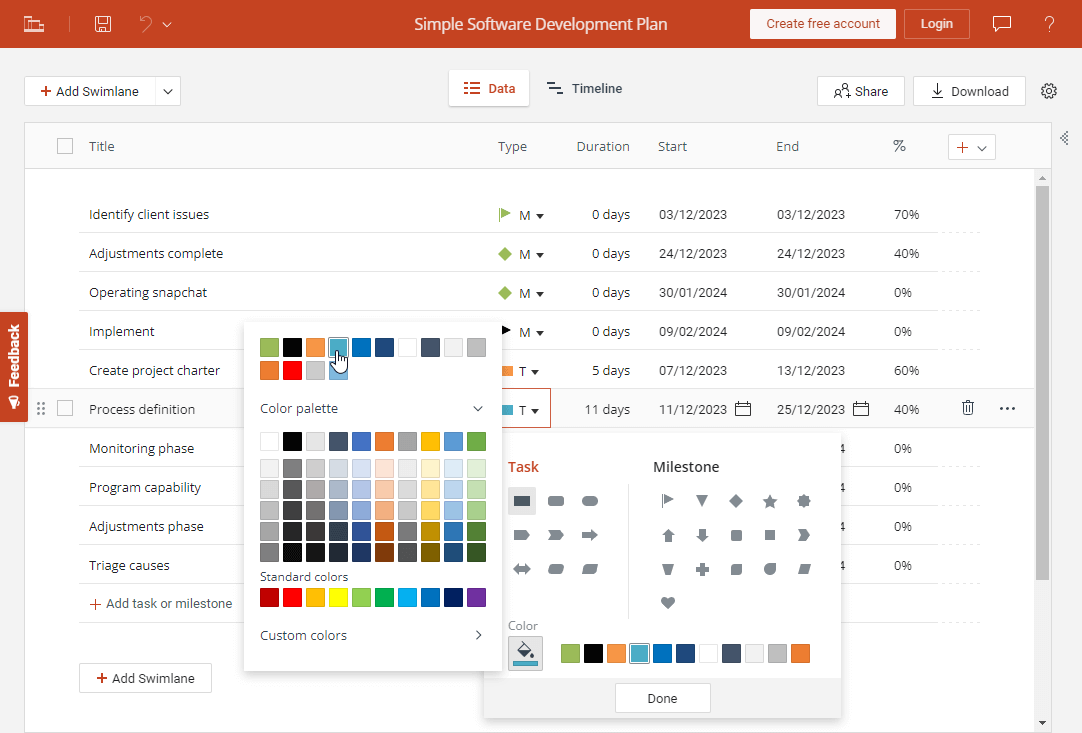 The free Gantt chart creator will open the template in the Data view, where you can replace the existing data with your own, add or remove tasks, show task status, and make a few quick customizations too (e.g. changing task colors and shapes):