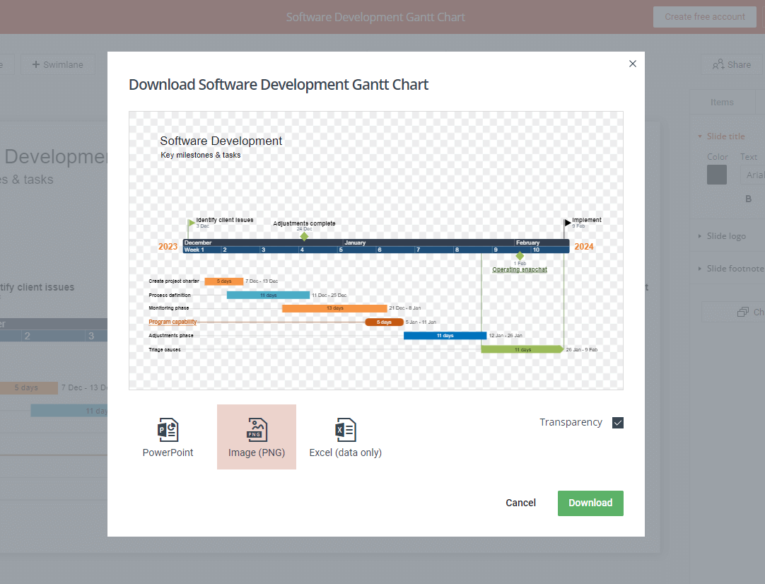 Now that you’ve managed to build a Gantt chart online so quickly, you can download it as a PNG image without registration, or you can create a free Office Timeline Online account to export your visual as an editable PowerPoint slide or an Excel spreadsheet.