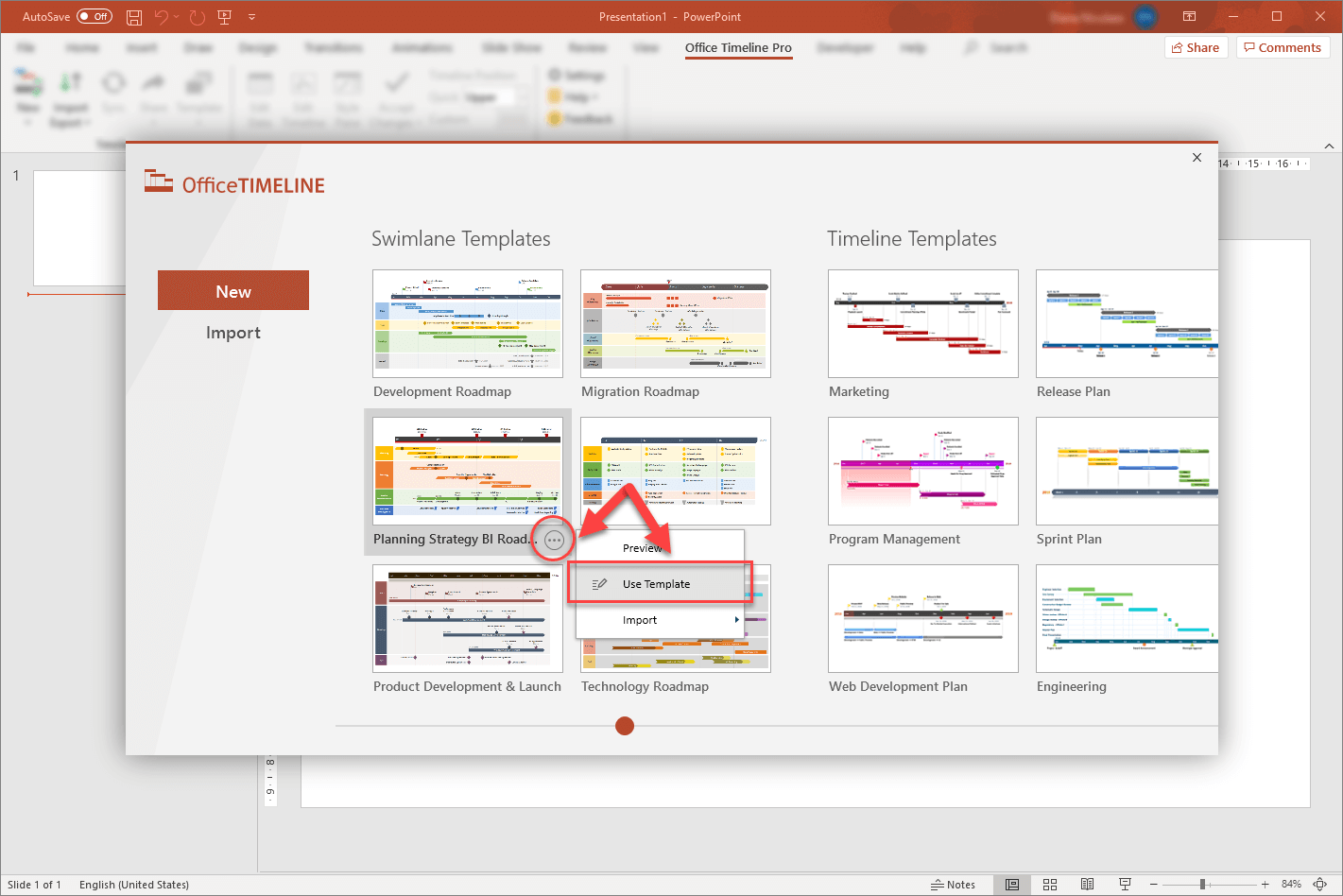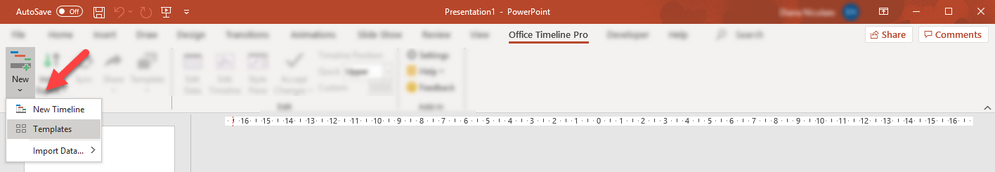 1. Inside PowerPoint, go to the Office Timeline tab, and then click on the New icon. From the dropdown menu, choose Templates.