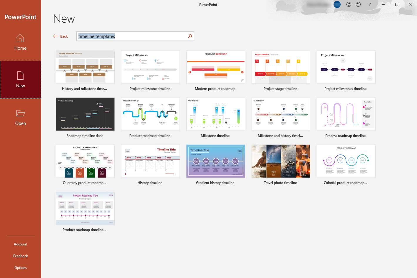 3. Type ”timeline template” in the Search box at the top of the page and press Enter.