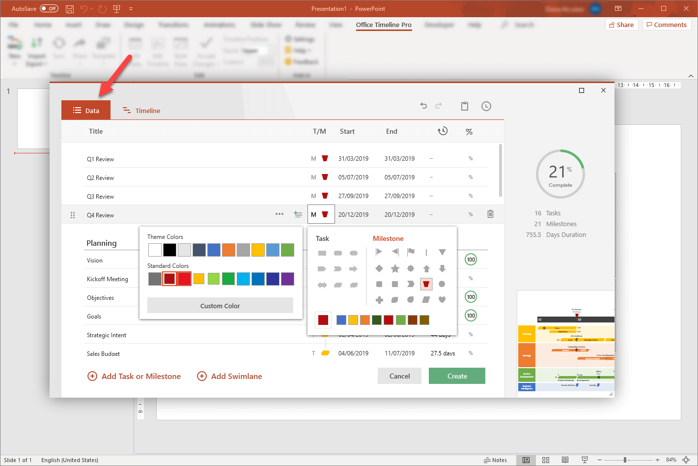 Once created, the timeline can be quickly styled further or updated automatically with the help of Office Timeline. For example, you can change shapes, colors, timescale and dates on the fly, or reposition items on the timeline using the add-in’s intuitive drag & drop interface. Not only that, but Office Timeline also allows you to create and save your own custom templates that you can use for future work.