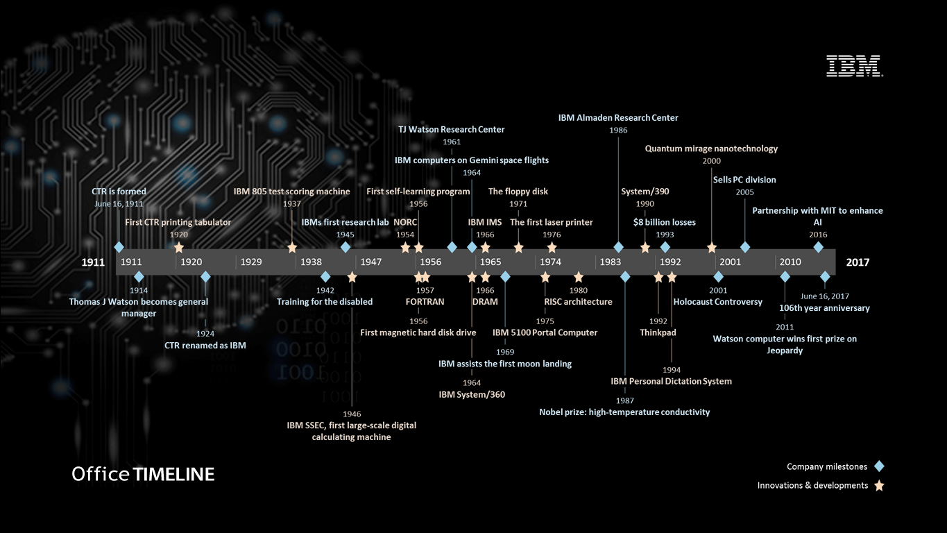 The IBM History illustration was built using the Office Timeline PowerPoint add-in and is free to copy, modify and distribute for private or public use. To build similar visuals fast and easily, we recommend using the Plus version of the app, a simple but powerful tool ideal for business and academic presentations.