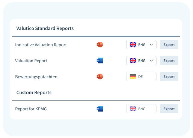Allowing you to access data, integrate it with your preferred valuation method, and export reports in a single-click, Valutico streamlines your Valuation process.
