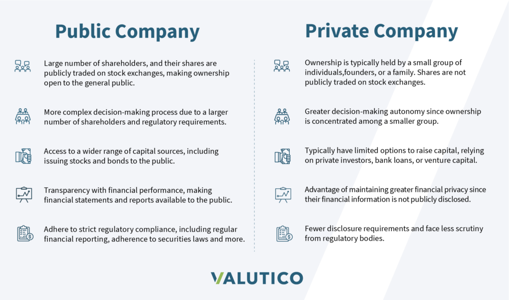 Private and public companies differ in several ways. Private companies have a smaller group of owners, and benefit from increased decision-making autonomy, confidentiality, and flexibility. In contrast, public companies, have a larger number of shareholders, are obligated to adhere to stringent regulations but gain the advantage of accessing robust capital markets. The choice between maintaining a private status or going public hinges on a company’s objectives and financial situation.