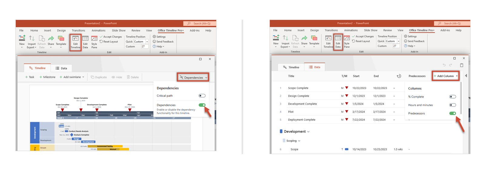 In Office Timeline Pro+, there are two ways that you can create and manage dependencies: