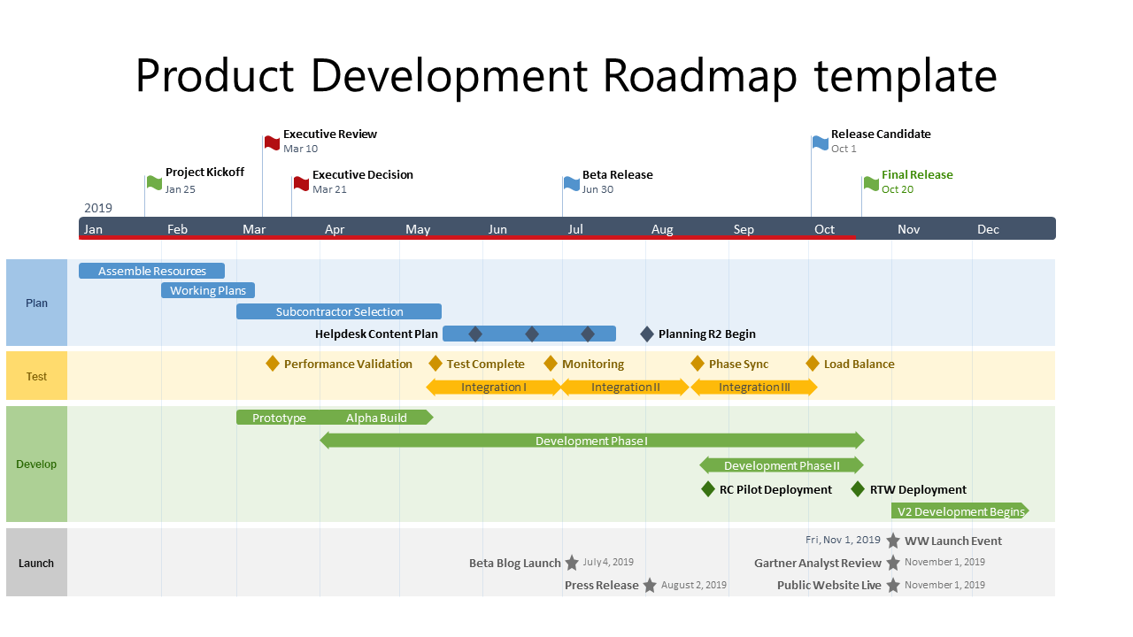 Another step you can take to improve the readability of your project roadmap once you’ve sequenced the tasks is to group them according to logical criteria. Office Timeline allows you to this easily thanks to a feature we’ve mentioned earlier: swimlane diagram templates. Check out the product launch management plan example below which breaks down the tasks and milestones into four logical categories.