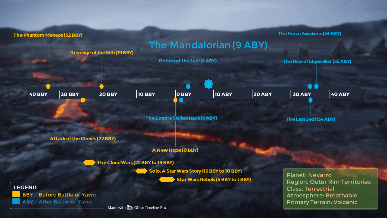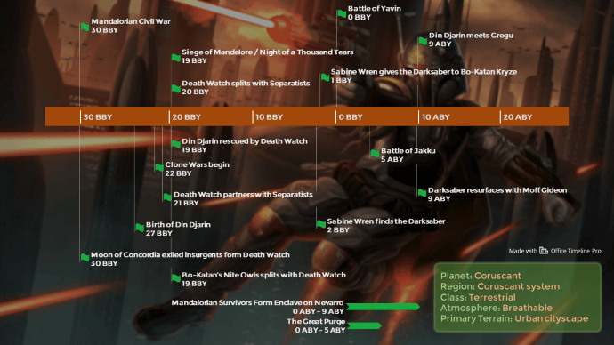 To celebrate the end of the second season for the multiple award winning show, we have created two timelines showing both how the story arc fits with the movies and the major events in the history of the Mandalorians using Office Timeline Pro. Office Timeline is a powerful yet easy to use PowerPoint add-in for project management that can create stellar visuals for your data in no time. Try out the free version or explore the Pro Edition, which comes with extra features for those who need more advanced applications.