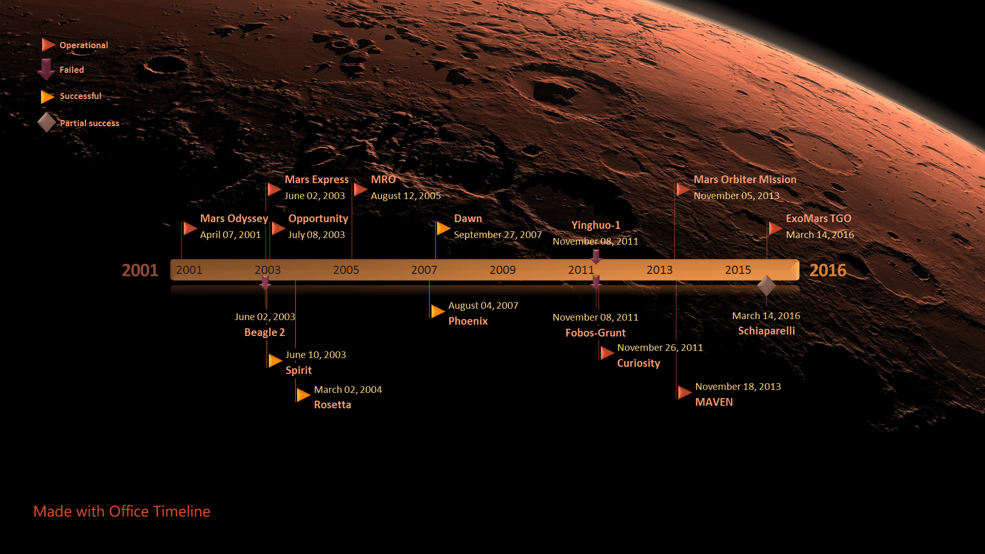 The Mars Exploration Timeline illustrates all expeditions to the Red Planet since the launch of the record-breaking orbiter. Successful expeditions are marked using bright orange flags, red indicates missions that are still active, while the arrow-shaped milestones stand for failed attempts. The Schiaparelli mission is represented by a distinct icon (the diamond) on the timeline because it was not a complete success. The lander crashed, but it managed to achieve its primary goal, returning important data during the first 5 minutes of its landing attempt.