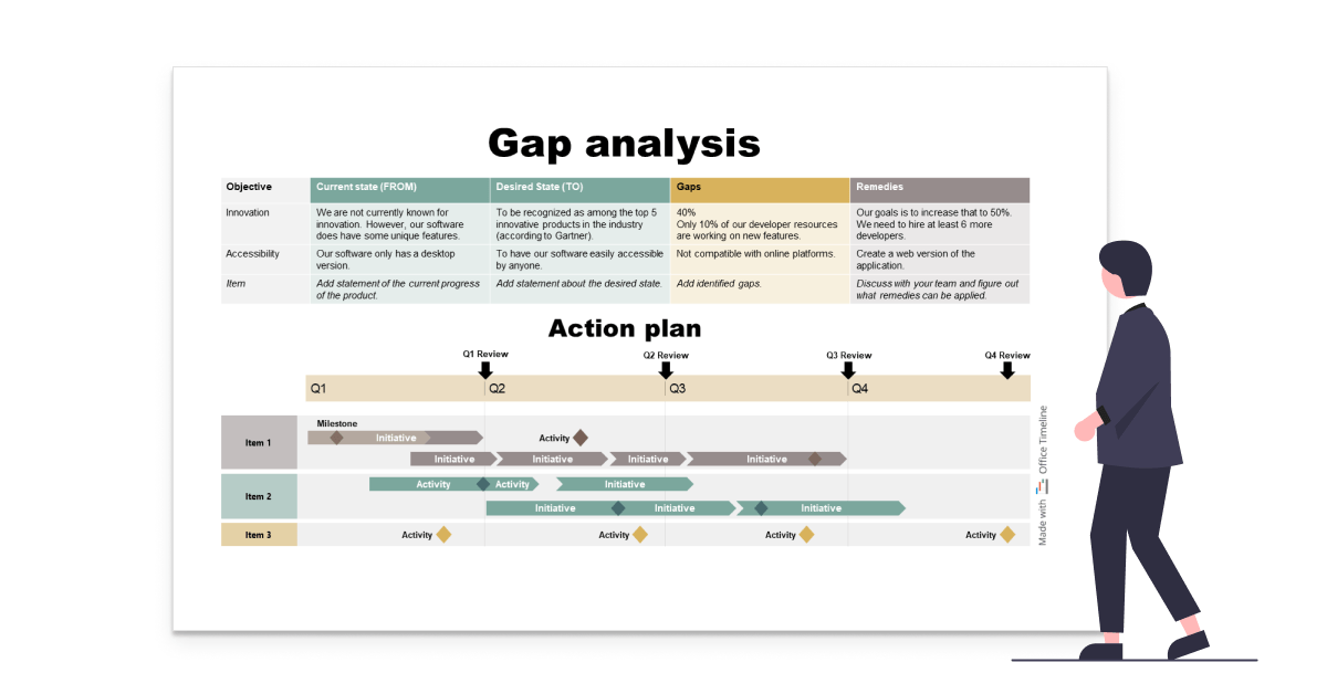 As you will most likely carry out this evaluation many times and in different contexts, we strongly recommend using templates, like the free downloadable PowerPoint template for gap analysis in our guide.
