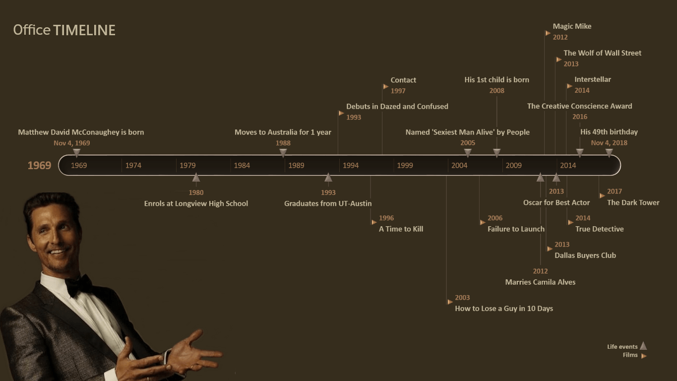 The Matthew McConaughey chronology was designed with Office Timeline, a PowerPoint extension that enables you to easily create stylish timelines and other similar visuals. The slide, which is available to be copied and shared for free, can be further restyled and updated using Office Timeline Plus Edition.