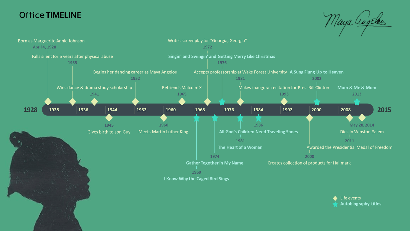 The Maya Angelou chronology was created with Office Timeline, a simple to use PowerPoint plugin that quickly and efficiently generates professional-looking timelines, Gantt charts, project plans and other similar visuals. The slide is free to copy and share and can be edited or restyled using the free 14-day trial of the tool.