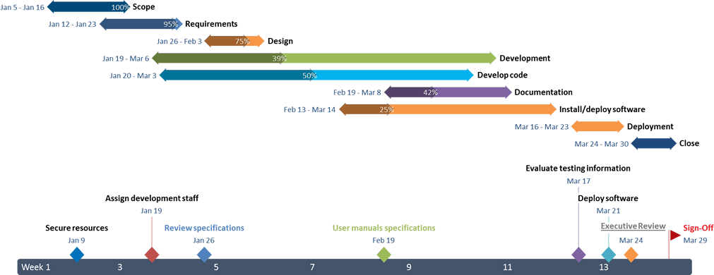 Simple Gantt chart diagram with well-defined tasks and milestones that help you clearly outline any project schedule.