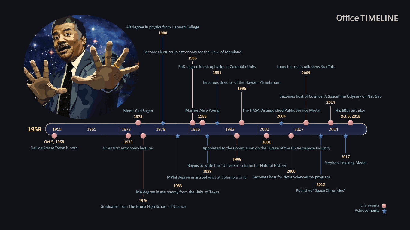 The Neil deGrasse Tyson chronology was created with Office Timeline, an intuitive PowerPoint plugin that allows users to build stylish timelines, Gantt charts and other similar visuals with ease. The slide is free to copy and share, and if you want to edit it or create a new one, we recommend using the Plus version of the tool.
