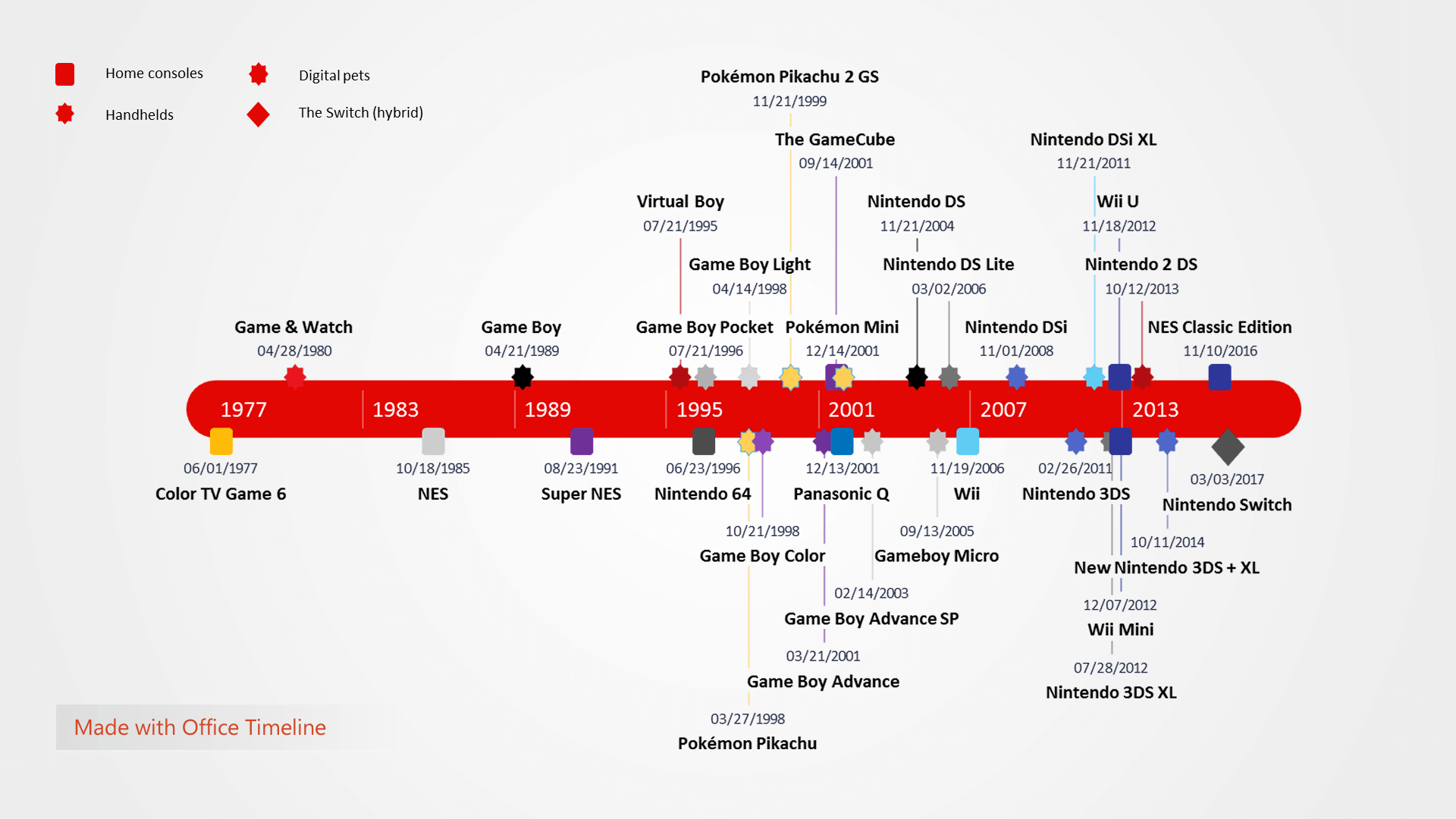 The illustration was created using the Office Timeline PowerPoint add-in and can be copied or reproduced for personal or public use. The free add-in can be used to edit the Nintendo Timeline PowerPoint slide or to quickly build similar visuals either for personal reference or for academic, business and legal presentations. While the free version of the software is fully functional and enables fast timeline creation, the Plus edition comes with more powerful features and customization options.