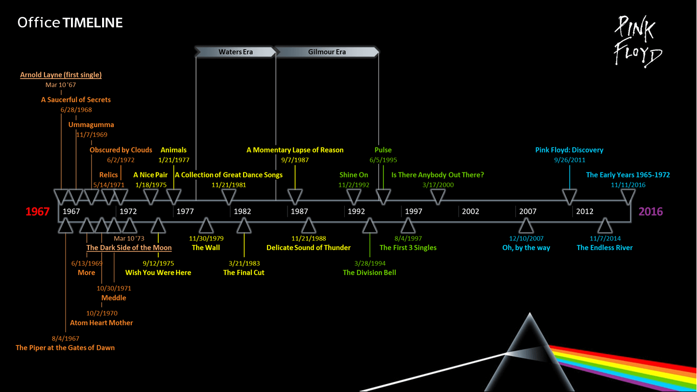 The Pink Floyd chronology was created with Office Timeline, a simple-to-use PowerPoint plugin that enables users to quickly generate historical timelines, visual plans and schedules, Gantt charts, or other similar graphics. The image is free to copy and share and can be updated or restyled easily using the free 14-day trial of the tool.