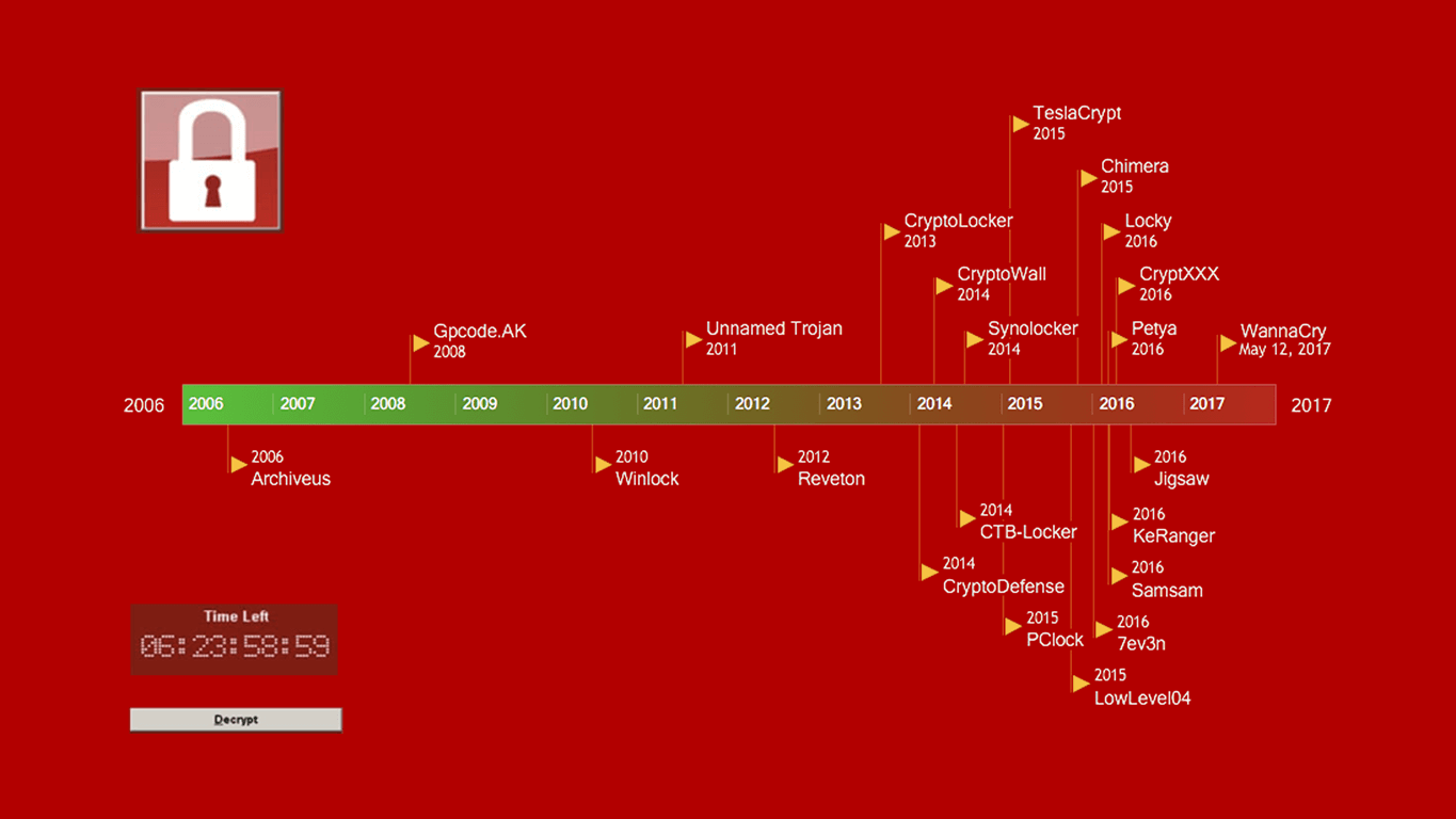 The Ransomware Timeline illustrates the most infamous cryptoviral extortion attacks throughout history, starting from Archiveus, discovered in 2006, to the recent WannaCry malware. While Archiveus was not the first ransomware case ever, it was the first strain to use asymmetric encryption, making it unprecedentedly invasive and difficult to remove. The Trojan encrypted all files in the My Documents folder and demanded victims to make purchases from an online pharmacy to receive the password that would unlock their data.