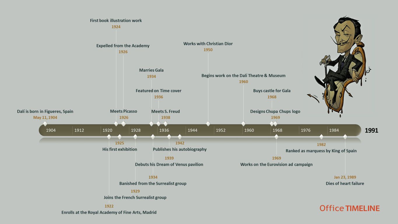 The Salvador Dalí chronology was built with Office Timeline, a user-friendly PowerPoint add-in that enables you to create professional-looking timelines, project schedules and other similar visuals with ease. You can update or edit the visual using the free 14-day trial of the tool.