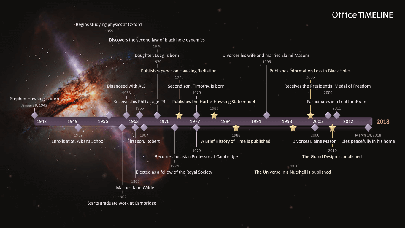The Stephen Hawking chronology was created with Office Timeline, a simple-to-use PowerPoint plugin that enables users to quickly generate historical timelines, visual plans and schedules, Gantt charts, or other similar graphics. The image is free to copy and share and can be updated or restyled easily using the free 14-day trial of the tool.