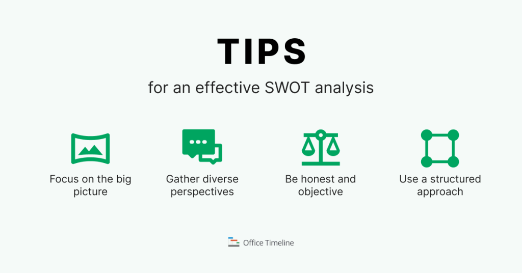 • With the free PowerPoint add-in from Office Timeline you can create stunning SWOT analysis diagrams in Microsoft PowerPoint with just a few clicks of the mouse, making your presentations stand out from the crowd. Office Timeline add-in features an extensive library of design elements, including graphics and color palettes that allow you to fully customize your SWOT analysis to match your brand identity. Our templates are not only visually stunning, but they are also designed to be easy to use, helping you to create a professional-looking SWOT analysis in minutes.