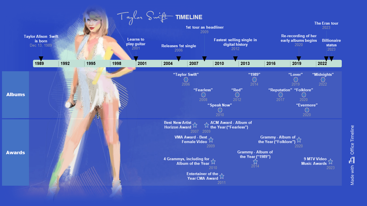 The Taylor Swift Timeline was created with Office Timeline, a powerful and user-friendly add-in for PowerPoint that quickly turns complex data into professional-looking chronologies. You can download the timeline as a PowerPoint slide for free and further customize it using the 14-day free trial, which offers additional features for a more sophisticated output.