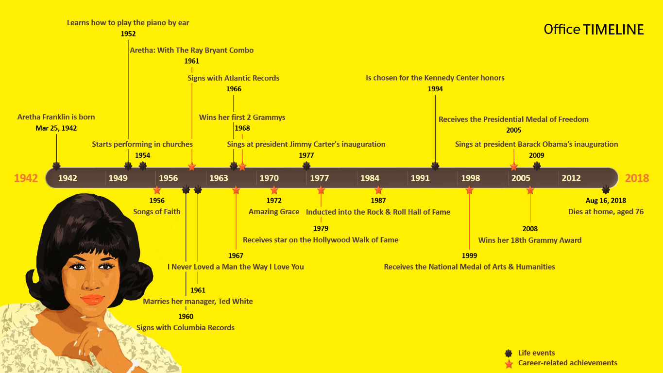 The Aretha Franklin chronology was created with Office Timeline, an intuitive plugin for PowerPoint that allows users to quickly and easily generate stylish timelines, Gantt charts and other similar visuals. The image, which is free to copy and share, can be further restyled and updated using the Plus version of the tool.
