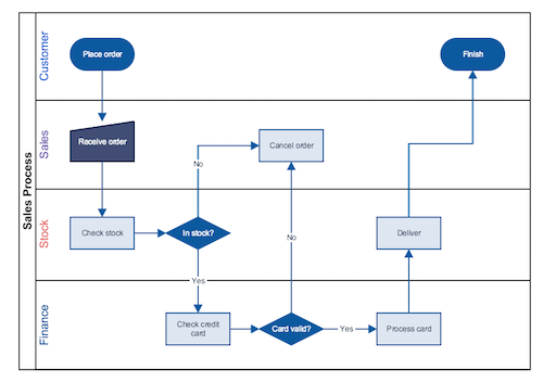 Flowchart diagrams can be used to represent an operation or a process visually, and rely on logical steps. This is why, in addition to project management and the development of business plans, another practical use for them is the design of mathematical algorithms. They can have just a few steps or can grow to be incredibly complex, which is when you can introduce swimlanes to organize them more easily. Here’s a swimlane diagram example of what a flowchart might look like: