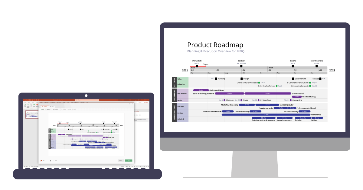 Available as both a desktop and online application, Office Timeline is the only visual project management tool that helps you generate stylish graphics as native, presentation-ready PowerPoint slides. Offering an intuitive automated interface and a diverse collection of Gantt chart, timeline, roadmap, and swimlane diagram templates that you can easily customize, Office Timeline simplifies project planning and communication big time.