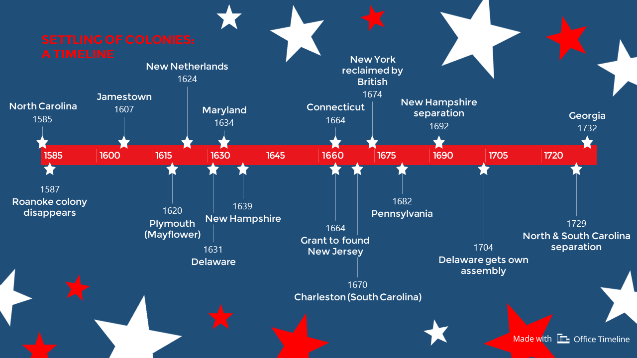 Get a quick view of the chronological order in which the first English colonies were founded on American soil with our condensed visual timeline below: