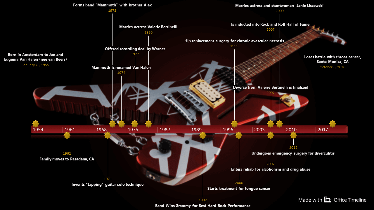 We have created the Eddie Van Halen timeline and the Van Halen albums timeline as a tribute to the rock legends using the Office Timeline PowerPoint add-in. You can download them free of charge as editable PowerPoint slides and add other major milestones that you feel we might have missed.