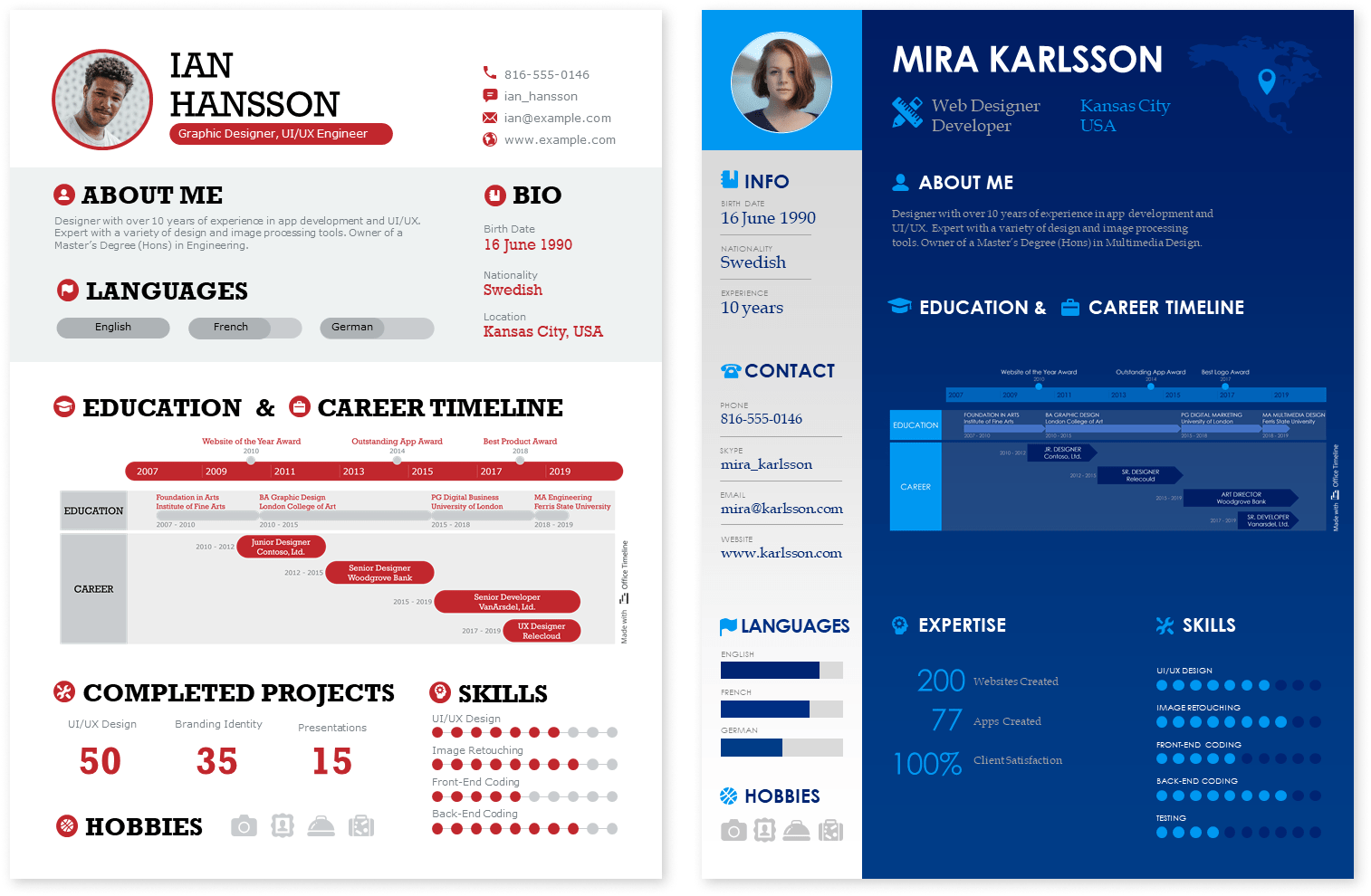 Bonus: You can easily save the timeline as an image (PNG with transparency) and import it into a regular resume to enhance readability. Here’s how our timeline resumes would look in a portrait format. You can also download these samples as a PowerPoint file and customize with your own data.