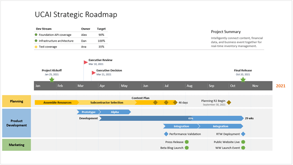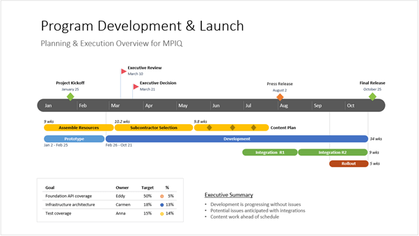 One solution my team found useful is the Office Timeline add-in for PowerPoint. My project managers found it valuable for quickly creating project slides that our VPs and executives loved. The visuals were uncomplicated and impressive and the automation saved our PM’s lots of time.