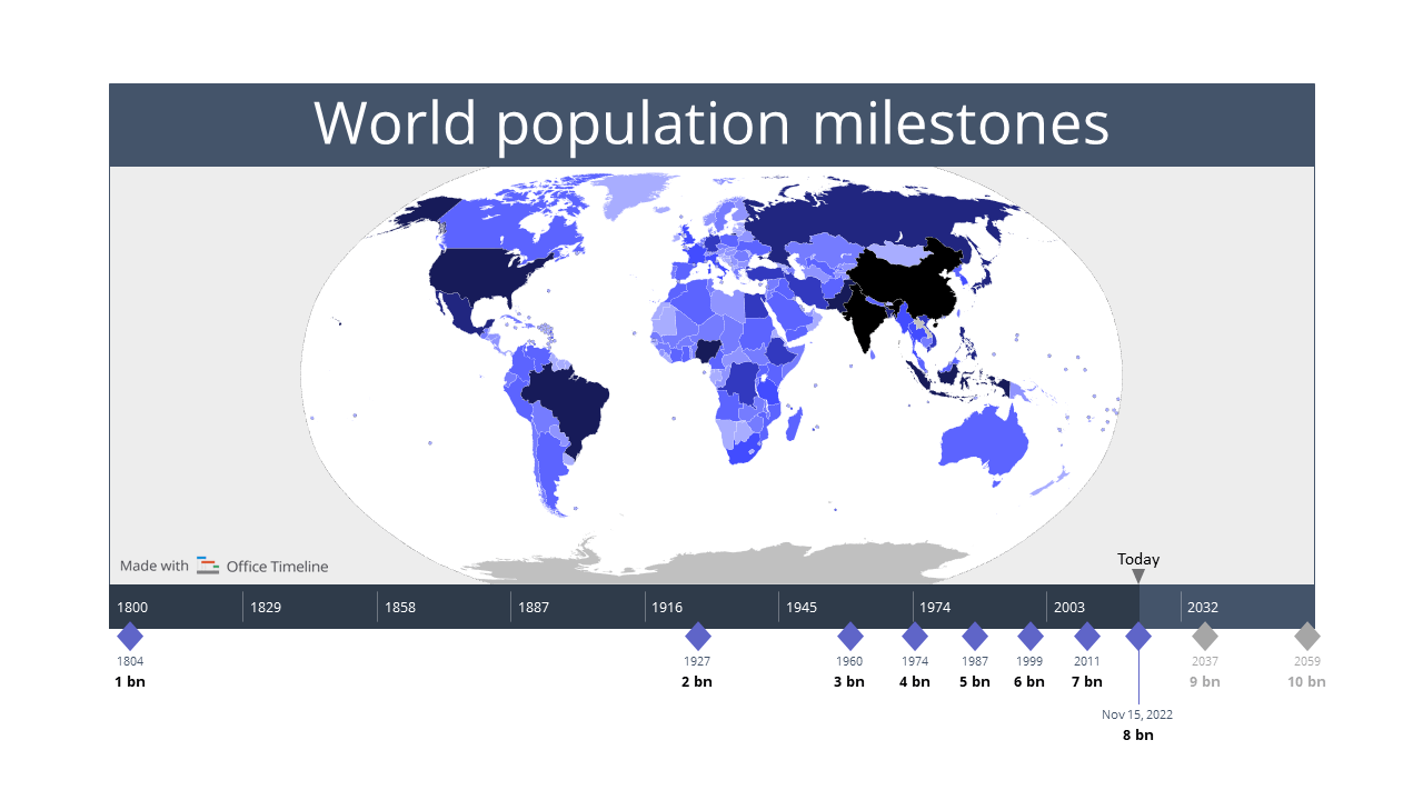 The visual timeline presenting the major global population milestones was created using Office Timeline, a user-friendly add-in for PowerPoint that takes your list of milestones and arranges them into easy-to-understand timelines. You can download the timeline as a PowerPoint file for free and update the milestones either manually, or automatically with the free 14-day trial from Office Timeline.
